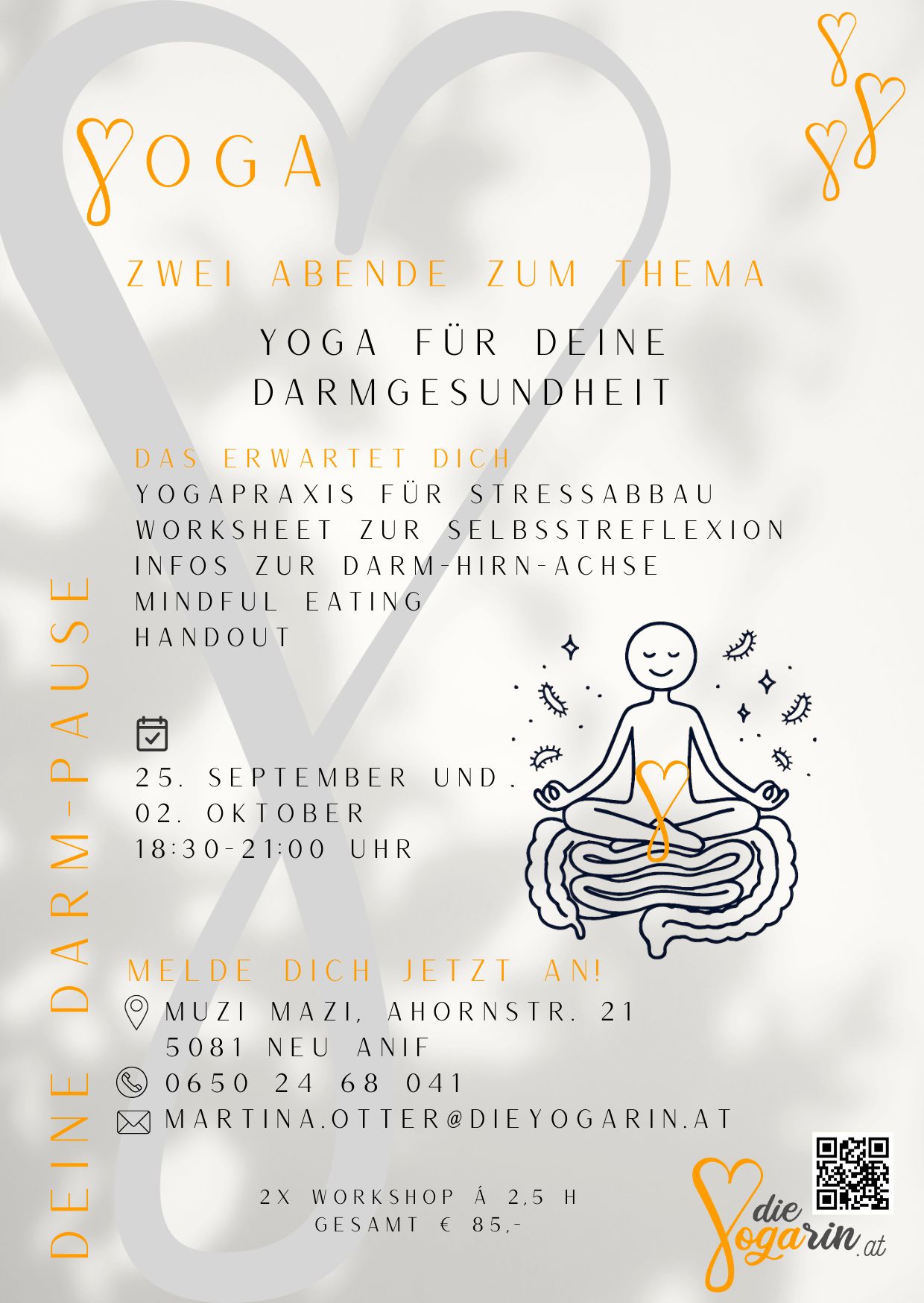 Mit einer gezielten Yogapraxis, geführter Selbstreflexion, Infos zur Darm-Hirn-Achse und darmflorafreundlichen Lebensmitteln inkl. "mindful eating" verwöhnst du deinen Darm mal so richtig.